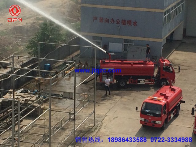 湖北江南專用特種汽車有限公司專門為小區(qū)、村鎮(zhèn)、糧庫、碼頭、校園、商場、工業(yè)園設(shè)計(jì)了一種簡易消防車又稱多功能灑水車,它有灑水車的前沖、后灑、側(cè)噴和工作平臺(tái),它的前沖寬度能達(dá)到14米,側(cè)噴水炮射程可以達(dá)到24米。